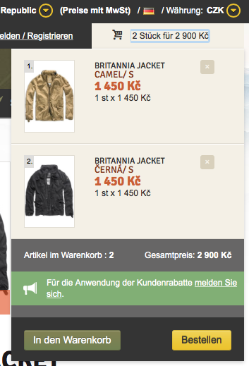 In der Produkt-Hauptkarte ist die gewünschte Stückzahl einzugeben. Wenn der Artikel in verschiedenen Ausführungen, Größen oder Farben erhältlich ist, sind gewünschte Parameter zu wählen und anschließend ist der Artikel in den Warenkorb zu legen. Stückzahlen können später jederzeit direkt im Warenkorb korrigiert werden.